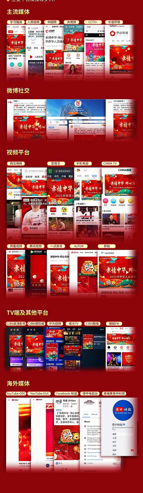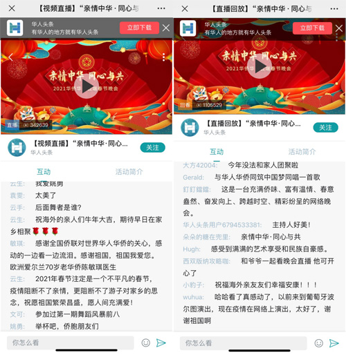 闔家團圓除舊歲,全球共迎中國年。由中國僑聯主辦的“親情中華·同心與共”2021華僑華人云端春節晚會于2月9日下午16:00通過“學習強國”學習平臺、人民視頻、中國網、央視頻、CCTV+及新浪微博、西瓜視頻、華人頭條、CIBN互聯網電視等網絡平臺播出,在海內外僑界引起熱烈反響。據統計,截至2月9日21:00,網絡觀看量累計達2403.5萬人次。