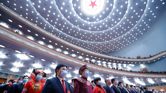 3月5日,第十三屆全國人民代表大會第四次會議在北京人民大會堂開幕。圖為代表起立唱國歌。(圖片來源:中新社)