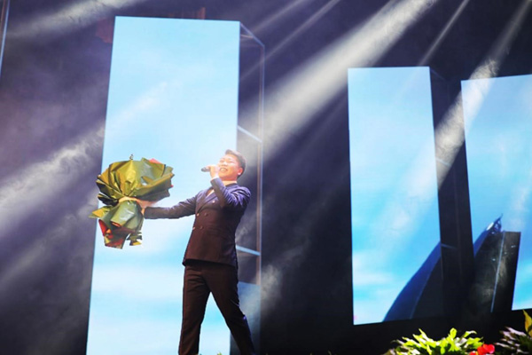 中國煤礦文工團著名男高音歌唱家、國家一級演員劉君俠傾情演唱《共和國之戀》《我們走在大路上》!拔乙呀洈挡磺遄约簠⒓舆^多少次‘親情中華’慰問演出,然而每一次,無論在國內還是海外,總會被廣大僑胞的愛國之情深深打動。作為聯絡僑胞的媒介之一,每當我們唱起祖國、唱起人民、唱起家鄉,臺下僑胞都會情不自禁潸然淚下!眲⒕齻b說。