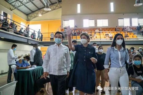 5月29日,在中國駐多米尼加大使館積極協調下,多政府在首都圣多明各奧林匹克中心擊劍館為旅多華僑華人舉辦“春苗行動”第二場新冠疫苗接種專場,為僑胞進行二劑次集中接種。多副總統培尼亞親赴現場,視察接種工作,慰問接種僑胞。中國駐多米尼加大使張潤陪同。