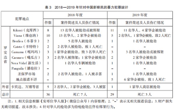 “在安哥拉,一定要‘安’字當頭”,這是筆者在田野調查期間聽到中國新移民說得最多的一句話。筆者統計了《安哥拉華人報》(微信公眾號)推送的近兩年針對中國新移民的暴力犯罪(見表3),發現中國新移民面臨的安全形勢復雜且嚴峻。