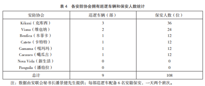 截至2019年6月,各安防協會已正常運營5年,實力不斷壯大(巡邏車輛及保安人數統計見表4)。雖然Nova Vida(新生活)、Panguila(潘給拉)兩處安防協會沒有專門巡邏車輛及專職保安隊伍,但中國新移民如果在該區域發生安全事故向安防協會求助,這兩處安防協會所依附的華企會動用企業的車輛和保安前往救援。