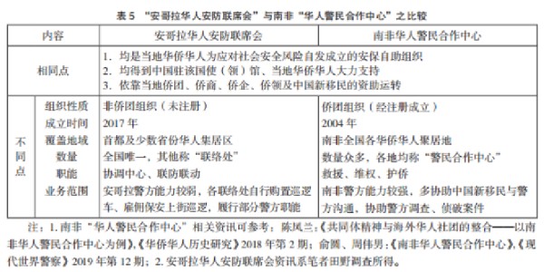 安聯會借鑒了同處非洲大陸的南非華僑華人創設“華人警民合作中心”的成功經驗,二者在維護華僑華人安全方面有頗多相似之處,但安哥拉的國情、僑情與南非有較大不同,安聯會成立時間較晚,其組織架構、機構職能、覆蓋范圍等具有諸多安哥拉特色,更符合安哥拉的社會安全實際(二者比較見表5)。