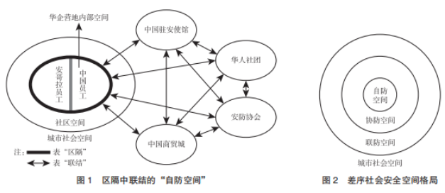 流動人口的社會空間是一種再造的空間,海外中國新移民的社會安全空間也是不斷再造和重塑的過程。面對安哥拉惡劣的社會治安形勢,中國新移民積極發揮主觀能動性,自下而上自組織空間營造,及時修復受損的社會安全空間,形成在區隔中聯結的“自防空間”及以“自防空間”為核心的差序社會安全格局,實現社會安全空間從“安全孤島”、“安全片區”向“安全地帶”蛻變。在當地僑領帶領下成立民間安防自助組織,對接中國駐安使館、當地警方等外部權力資源,讓安全問題演變成安全政治,促使政府權力自上而下地適應、妥協與變革,在僑居國城市空間編織出一張“點—線—面”相結合的立體安全防護網絡,完成安全空間的自我構建、修建與再建。