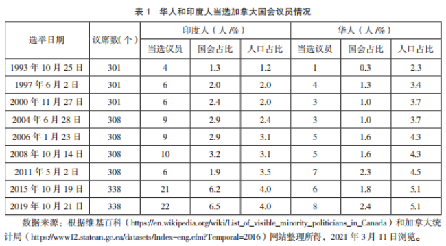 政治參與是移民政治社會化行為的集中體現,反映其介入居住國國家政治的行動意向和實際效果。華人和印度人是當今加拿大第一和第二大少數族裔(Visible Minority)。2016 年,加拿大華人人口達176.9 萬,占總人口的5.1%;印度人人口為137.5 萬,占總人口的4%。隨著族裔力量的增強,他們在政治上日漸活躍。但就選舉參與狀況看,印度人參政成效明顯高于華人,二者在代表權上的鴻溝愈發明顯。因此,社會經濟地位上有著諸多相似的兩個族群,政治融入進程為何存在明顯差異,成為一個值得探究的話題。