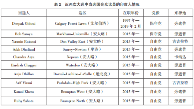 首先,當選人數創歷史新高,二者“代表權鴻溝”凸顯。2015年,有21名印度人當選國會議員,占少數族裔議員總數的45%和全部國會席位的6.2%。2019年,當選人數增至22名,占國會席位的6.5%,呈現“超比例代表權”的特征(見表2)。其中,4 位被提名為部長,職位最高的當屬國防部長石俊(Harjit Sajjan)。華人也積極投身于選舉之中,2019年,有8名候選人當選,較上屆多出2人,創造了華人參政的新紀錄。與以往相比,華人參政出現可喜變化。然而,華人參政水平與其人口規模和經濟實力仍不相稱,如果按人口比例計算,加拿大國會中至少應有17名華人議員,目前連一半都不到。“內閣中偶爾涌現的個別華人部長,多是政黨勝出的大勢和內閣多元比例要求的結果,在邊緣化位置上難以有所作為。”