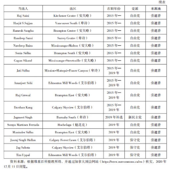 再次,參選失敗率較高,參政群體分布不均衡。雖然華人和印度人參政熱情不斷高漲,參選人數屢創新高,但是,參選落敗的比例遠高于成功當選的比例。在最近兩次大選中,華人參選失敗率約為80%,印度人亦有70%~75%,這與參選人集中在族裔人口聚集的選區不無關系。在華人和印度人次群體中,中國香港移民和印度旁遮普邦的錫克人參政成效明顯。在當選華人中,一半為香港移民,而占全加總人口僅1.4%的錫克人獲得了19個國會席位和3個內閣職位。中國大陸新移民和印度古吉拉特邦的參選人數亦有增加,但成功者僅3位,分別是董晗鵬、阿里夫·維拉尼(Arif Virani)和亞斯名·拉坦西(Yasmin Ratansi)。