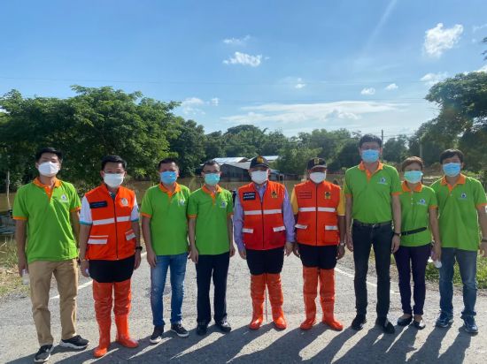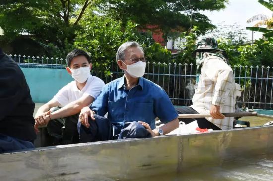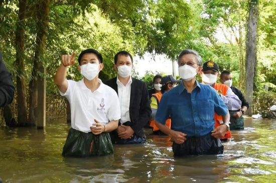 泰國(guó)國(guó)會(huì)主席川立派閣下、伊沙拉國(guó)會(huì)議員、信武里府尹等步行或乘船赴災(zāi)區(qū)第一線