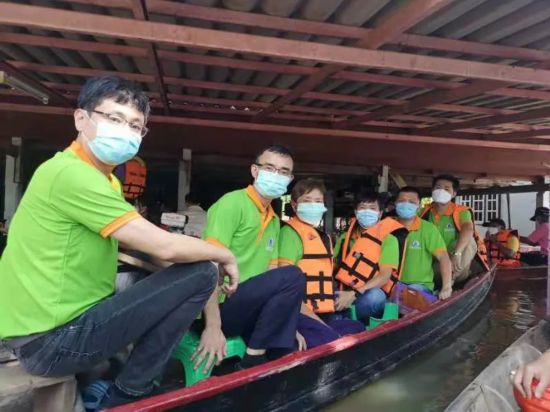 泰國(guó)泉州晉江聯(lián)合總會(huì)會(huì)長(zhǎng)蔡上新、執(zhí)行會(huì)長(zhǎng)陳俞龍、副會(huì)長(zhǎng)許清流、洪世界、張孚杰、常務(wù)理事黃淑芬、顧問(wèn)許宗會(huì)乘小船進(jìn)入災(zāi)區(qū)