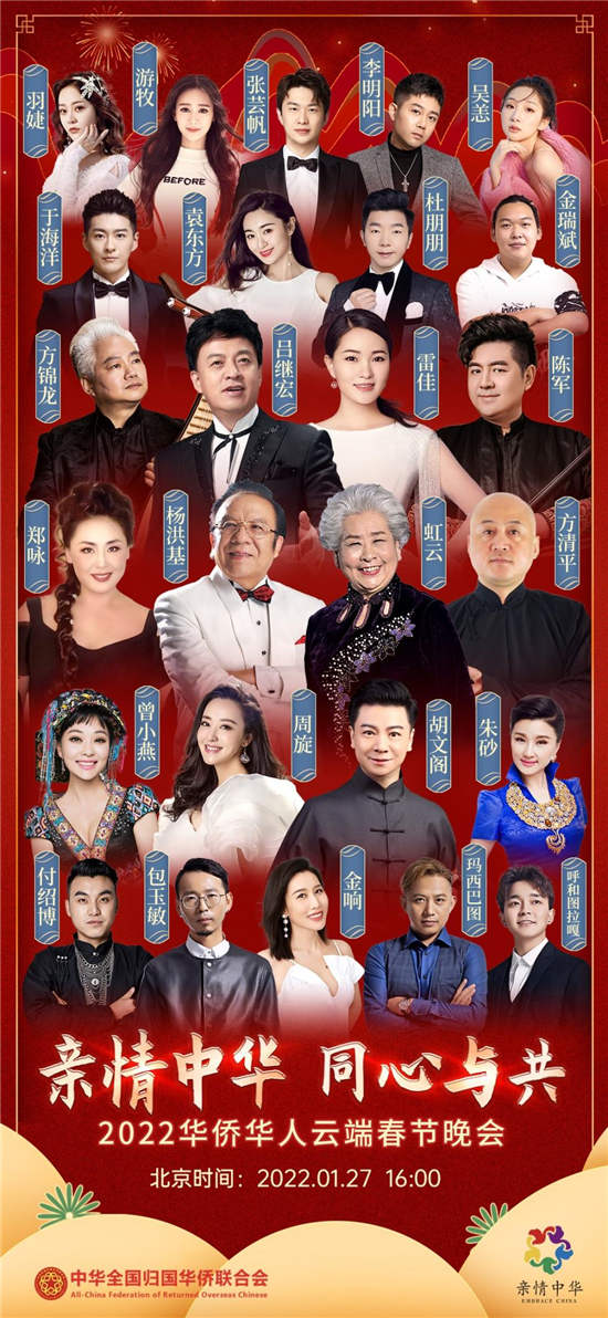 “親情中華·同心與共”2022華僑華人云端春節晚會將于北京時間2022年1月27日16:00盛大開啟!屆時將在學習強國、央視頻、中國網、愛奇藝國際版、騰訊視頻、華人頭條等20余家平臺同步直播!