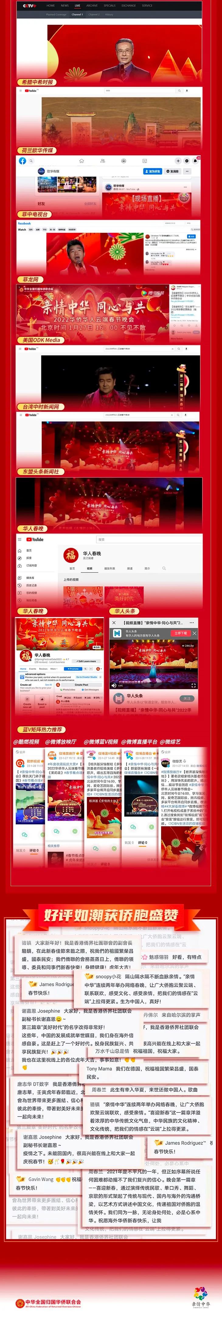 晚會在海內外僑界引發熱烈反響、好評如潮,認為晚會緊扣僑胞精神需求,年味、僑味十足,節目設計獨具匠心、精彩紛呈,傳遞出祖(籍)國對僑胞的惦念、關愛,激勵海內外中華兒女團結一心、攜手向前,共創美好未來。現將部分僑胞的感想感言選登如下: