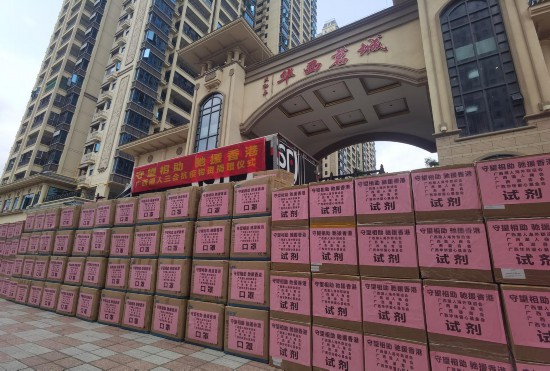 共有2萬人份的新冠檢測試劑、11萬個KN95成人口罩、1.1萬個兒童口罩等抗疫物資通過專車運往香港。