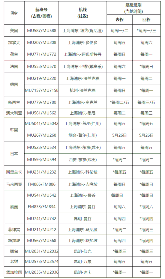 自2022年5月1日0時至2022年5月31日24時,東航、上航每周可執行國際航線累計21條。具體航班計劃如下: