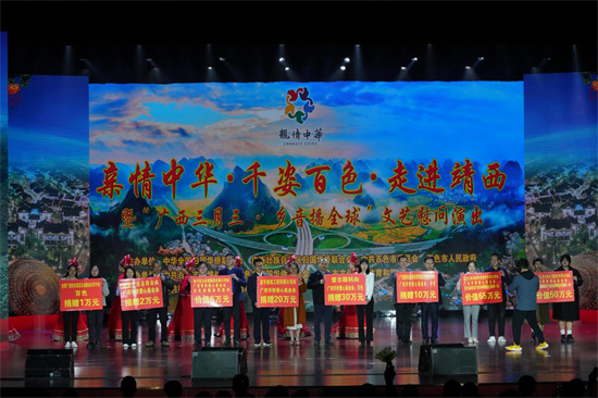 3月30日,“親情中華·千姿百色·走進(jìn)靖西”暨“廣西三月三·鄉(xiāng)音播全球”文藝慰問演出在地處祖國(guó)西南邊陲、壯歌之鄉(xiāng)——廣西百色靖西市舉辦。中國(guó)僑聯(lián)文化交流部副部長(zhǎng)邢硯莊,廣西僑聯(lián)黨組書記、主席陳潔英,百色市委常委、統(tǒng)戰(zhàn)部部長(zhǎng)閆炳辰等出席晚會(huì)并致辭,百色市直有關(guān)部門和靖西市領(lǐng)導(dǎo)及相關(guān)部門領(lǐng)導(dǎo)、部分歸僑僑眷、海外僑胞、僑商代表以及各界群眾1000余人在現(xiàn)場(chǎng)觀看演出。海內(nèi)外190多萬人次通過“華人頭條”“中新網(wǎng)”等海內(nèi)外媒體觀看了直播。