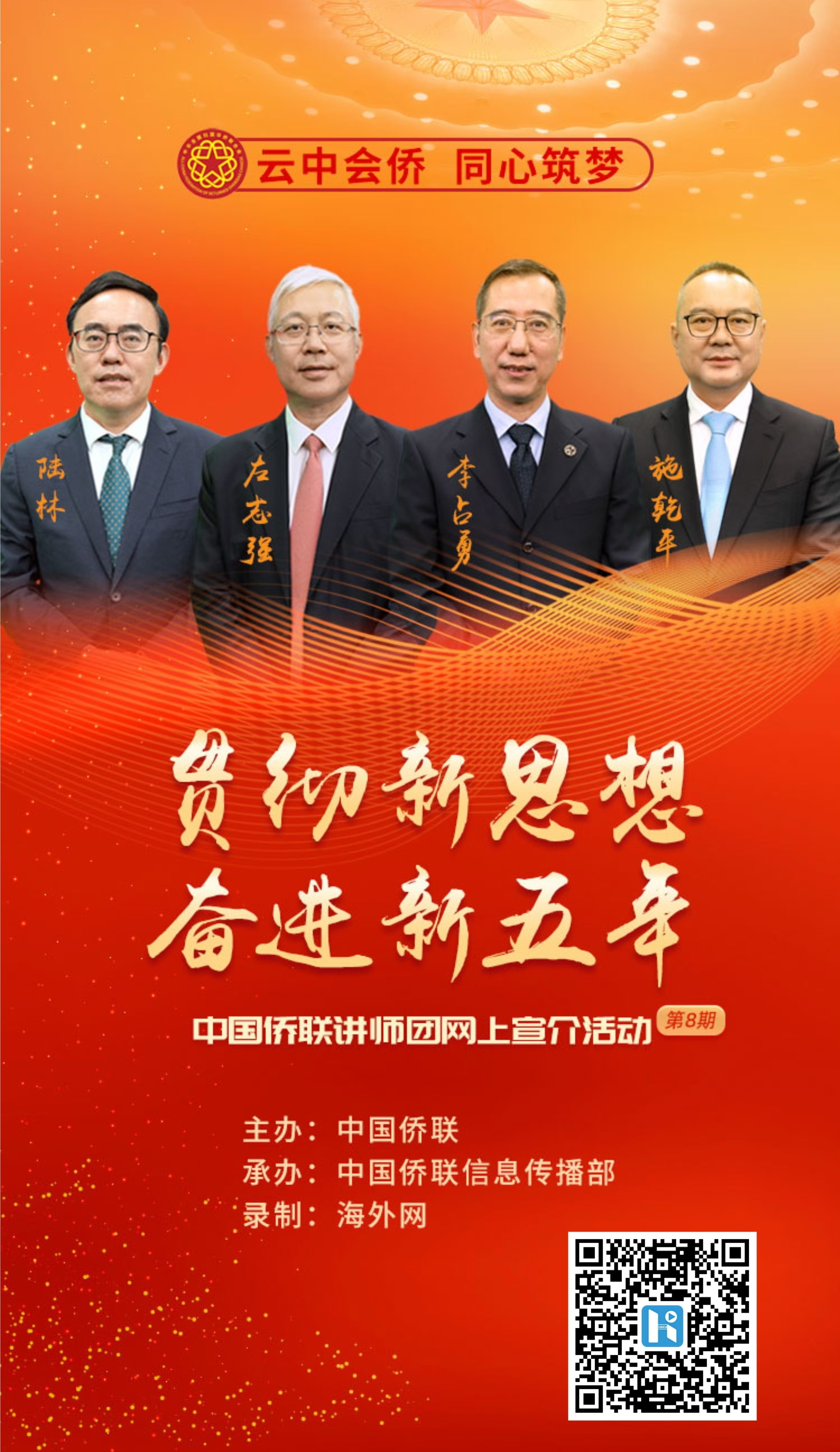 為深入學習貫徹習近平新時代中國特色社會主義思想,宣傳闡釋第十一次全國歸僑僑眷代表大會精神,宣介中國僑聯和僑聯系統過去五年服務大局、服務僑胞所取得的成就和未來五年的工作重點,宣介歸僑僑眷和海外僑胞典型事跡和先進人物,講述他們與新時代同行的感人故事,加強思想政治引領、進一步凝聚僑心僑力僑智,更好匯聚海內外中華兒女的力量,為實現中華民族偉大復興作出新貢獻,中國僑聯策劃錄制并即將推出講師團網上宣介(第八期)視頻。