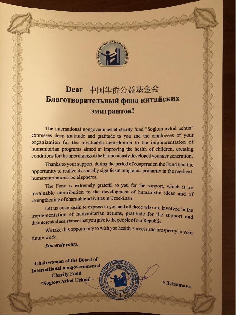 (給中國華僑公益基金會感謝信)