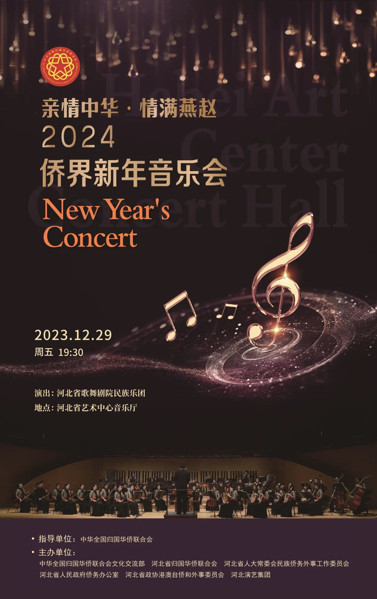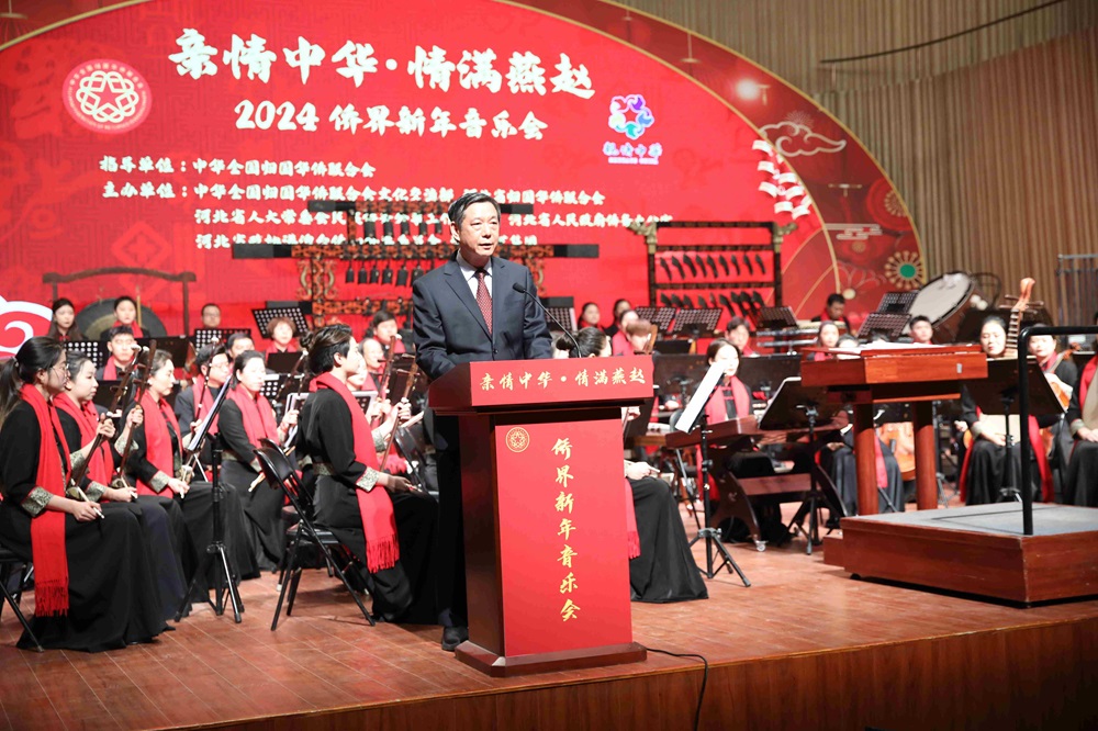 2023年12月29日晚,由中華全國歸國華僑聯合會指導,中華全國歸國華僑聯合會文化交流部、河北省歸國華僑聯合會、河北省人大常委會民族僑務外事工作委員會、河北省人民政府僑務辦公室、河北省政協港澳臺僑和外事委員會、河北演藝集團主辦,河北省歌舞劇院民族樂團承辦的“親情中華·情滿燕趙”2024僑界新年音樂會,在河北省藝術中心舉行。在激昂的音樂聲中,廣大歸僑僑眷、海外僑胞共迎新年到來。