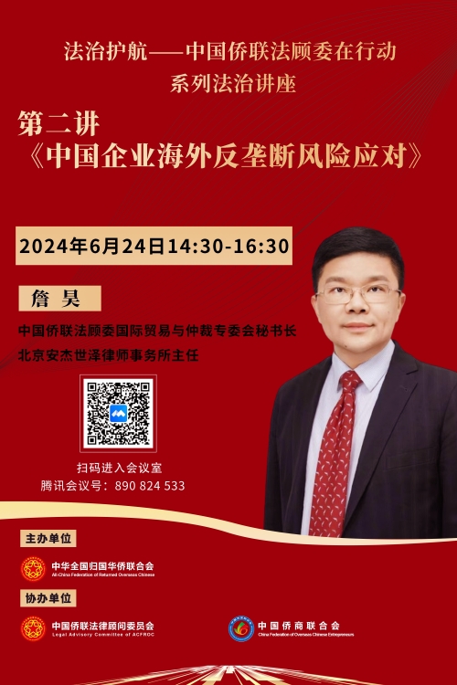 第二講將于6月24日14:30開播,由中國僑聯法顧委國際貿易與仲裁專委會秘書長、北京安杰世澤律師事務所主任詹昊律師主講,題目是《中國企業海外反壟斷風險應對》。聽課鏈接參見下方海報。