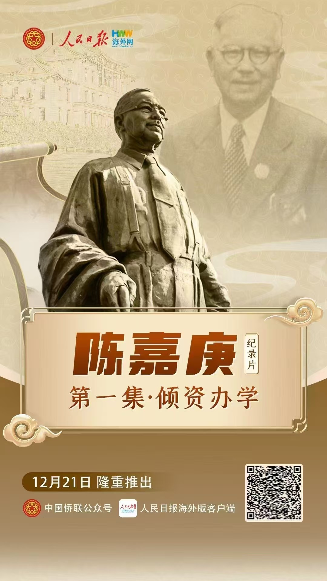 今年是陳嘉庚先生誕辰150周年,為深入貫徹習近平總書記2014年給廈門集美校友總會的重要回信精神,弘揚新時代嘉庚精神,激發(fā)僑心向黨、團結奮斗的強大力量,中國僑聯(lián)指導人民日報海外網拍攝制作了四集紀錄片《陳嘉庚》。第一集《傾資辦學》講述了陳嘉庚先生在海內外捐資助學、興辦教育的感人事跡。