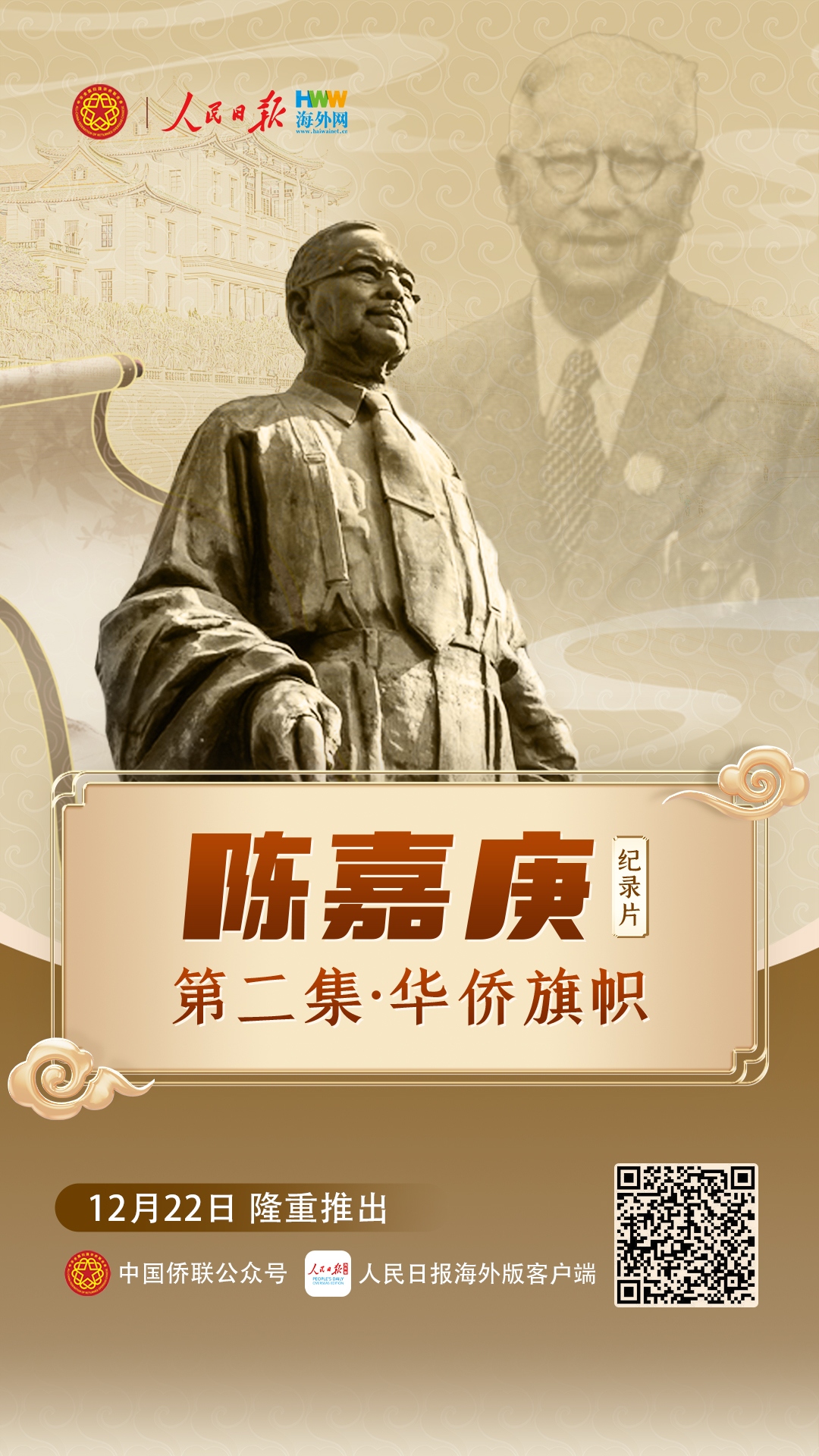 今年是陳嘉庚先生誕辰150周年,為深入貫徹習近平總書記2014年給廈門集美校友總會的重要回信精神,弘揚新時代嘉庚精神,激發僑心向黨、團結奮斗的強大力量,中國僑聯指導人民日報海外網拍攝制作了四集紀錄片《陳嘉庚》。第二集《華僑旗幟》講述了陳嘉庚先生團結海內外僑胞抗日救亡力量,為抗戰籌措經費、動員南僑機工回國服務的愛國事跡。