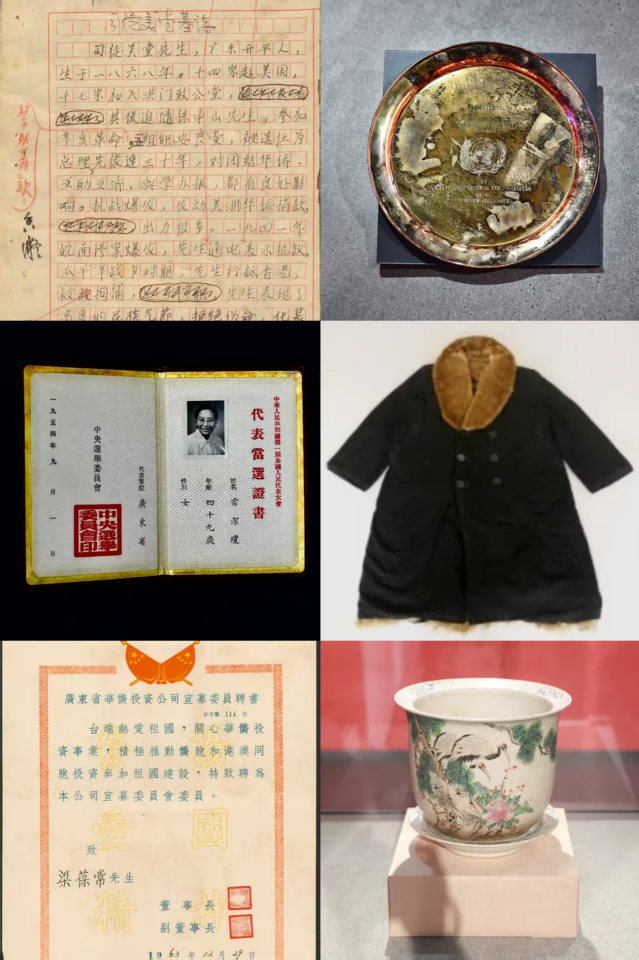 本次展覽共展出來自30家單位逾200件(套)藏品,其中,入選“共和國印記”見證物的6件江門五邑地區的見證物首次集中展出,分別是:中央人民政府華僑事務委員會主任何香凝親筆修改的司徒美堂墓志銘初稿,留學歸國學者雷潔瓊第一屆全國人民代表大會代表當選證書,廣東省華僑投資公司宣募委員、加拿大僑胞梁葆常聘書,新中國首任聯合國副秘書長、美國歸僑唐明照1979年離任聯合國副秘書長時的紀念銀盤,著名愛國僑領司徒美堂1949年回國后周恩來總理贈予的大衣,周恩來總理1958年送給印尼歸僑關崇澗的花盆。