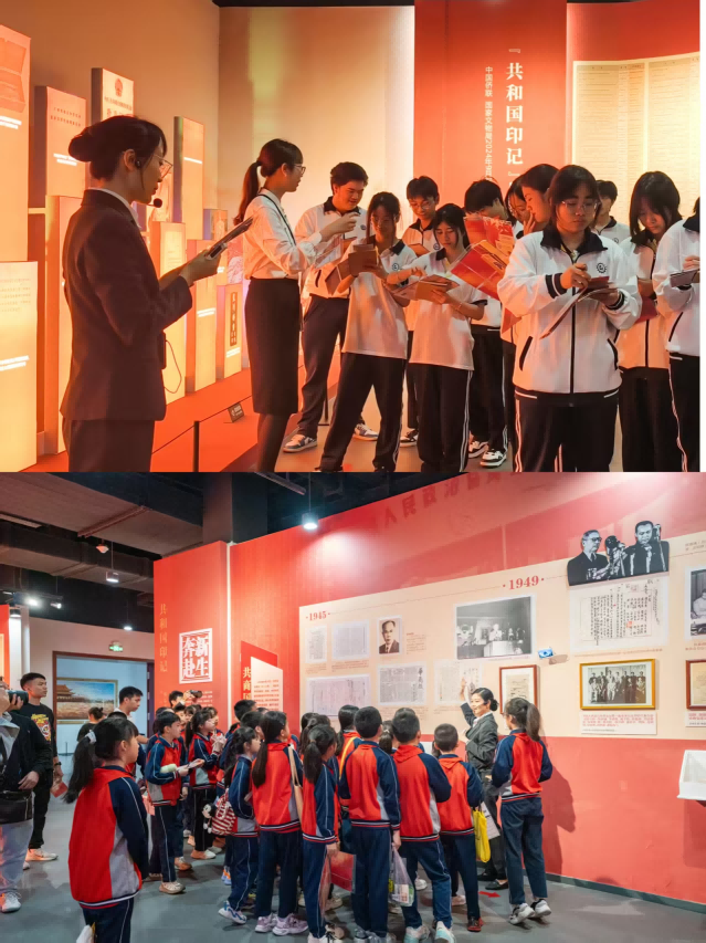 在開幕當天,僑博館舉辦“共和國印記主題研學”活動,來自江門市美景小學、范羅岡小學以及江門技師學院的師生深入展廳開啟紅色文化浸潤之旅。