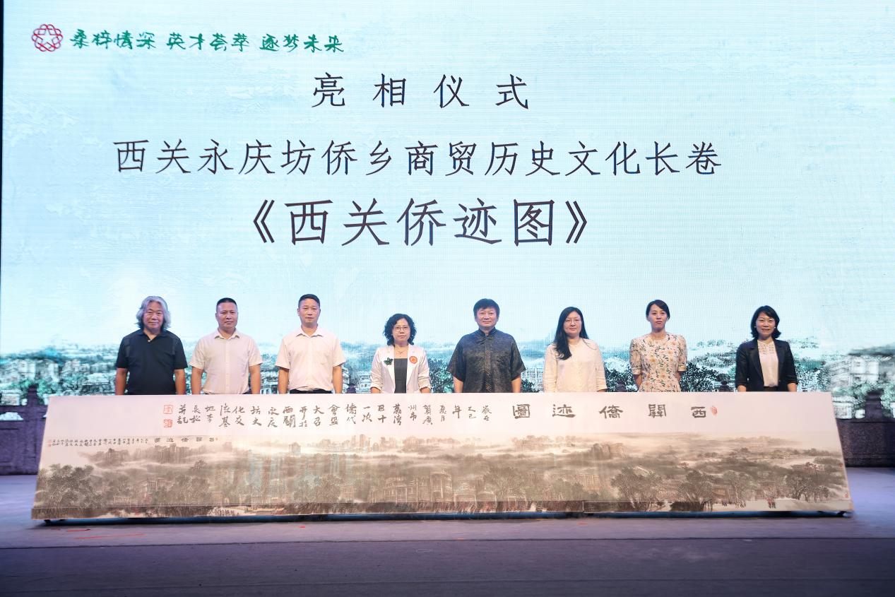 在潑墨儀式上,西關永慶坊僑鄉商貿歷史文化長卷《西關僑跡圖》正式亮相。該長卷是荔灣區僑聯為落實《做強荔灣僑胞節》特色僑品牌活動的人大建議和《搭好僑界平臺 講好荔灣故事——發揮西關永慶坊中國華僑國際文化交流基地作用》的政協提案,深入挖掘區史僑史,經過兩個月的策劃,以大會舉辦地——西關永慶坊連片為背景,用筆墨繪就荔灣西關古今繁華,將西來初地、錦綸會館、八和會館、永慶坊騎樓街、泮溪酒家、海山仙館等古今名勝、人文薈萃躍然紙上,串點成線,連線成面,重現了西關都市僑鄉商脈、文脈、僑脈。英國僑領薛先生盛贊:“這就是一幅荔灣僑界的清明上河圖”。