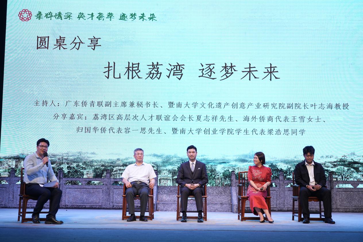 投資環境推介環節,荔灣區協作辦以“三大平臺”為核心宣傳推介荔灣區的區位優勢、產業規劃及投資機遇,聚力招商引資,立足荔灣資源優勢,吸引優質企業和高端人才進駐。隨后的圓桌分享會上,廣東僑青聯副主席兼秘書長、暨南大學文化遺產創意產業研究院副院長葉志海副教授,荔灣區高層次人才聯誼會會長夏志祥先生、海外僑商代表王雪女士、歸國華僑代表容一思先生與暨南大學創業學院學生代表梁浩思同學展開主題演講,從不同維度分享他們的見解和洞察,給新僑人才創新創業以更多的啟發和靈感。