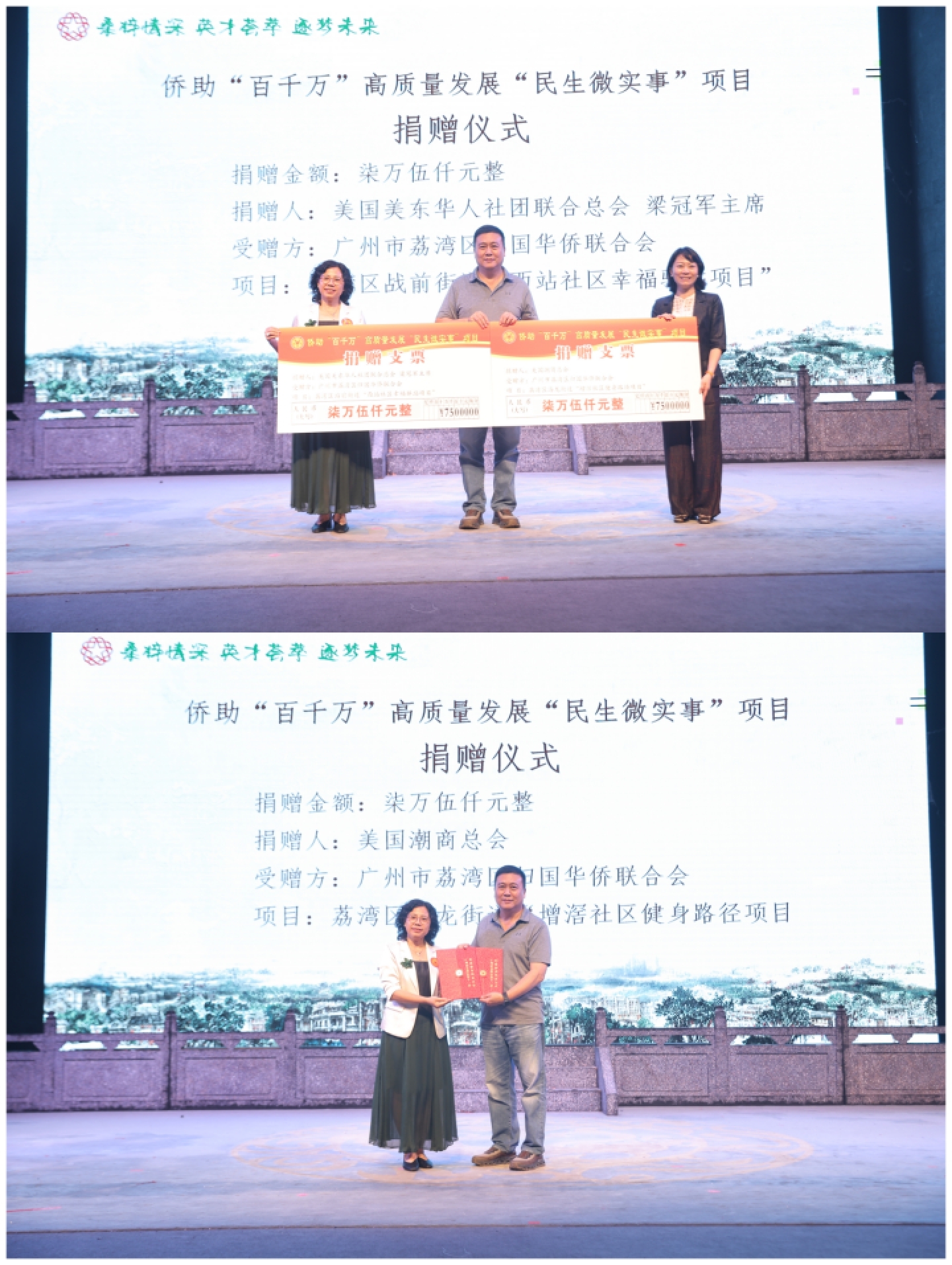 (圖:兩位愛心僑領分別向荔灣“百千萬工程”民生微實事項目捐款共15萬元)