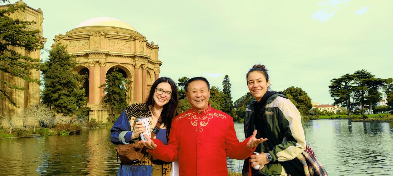 “你穿這件中國紅服飾真好看!”隨后,她們主動提出要為我和夫人拍照,那熱情的模樣讓人無法拒絕。在拍照過程中,她們不斷調整角度,還不時給出一些拍照的小建議,十分專業。拍完照后,她們又興奮地表示想與我合影留念,我欣然同意。站在兩位美國美女中間,我臉上綻放著由衷的笑容。我本就愛笑,歲月雖在我臉上留下了七旬的痕跡,但我的內心依然充滿活力,而此刻,這件中國紅服飾似乎讓我的笑容更具感染力。我們一起擺出各種姿勢,歡快的笑聲在這片美麗的土地上回蕩,中國紅與美國的美景與異國的友人,共同構成了一幅和諧美好的畫面。