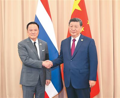 習近平指出,中國和泰國是好鄰居、好朋友、好親戚、好伙伴,常來常往、親如一家。2022年11月我訪問泰國,中泰關系進入構建命運共同體的新階段,兩國友好根基更牢、合作動能更強。今年是中泰建交50周年暨“中泰友誼金色50年”。站在新起點上,雙方要繼往開來,共同推動中泰命運共同體建設走深走實,助力兩國各自現(xiàn)代化進程,為地區(qū)和平穩(wěn)定和發(fā)展繁榮作出更大貢獻。