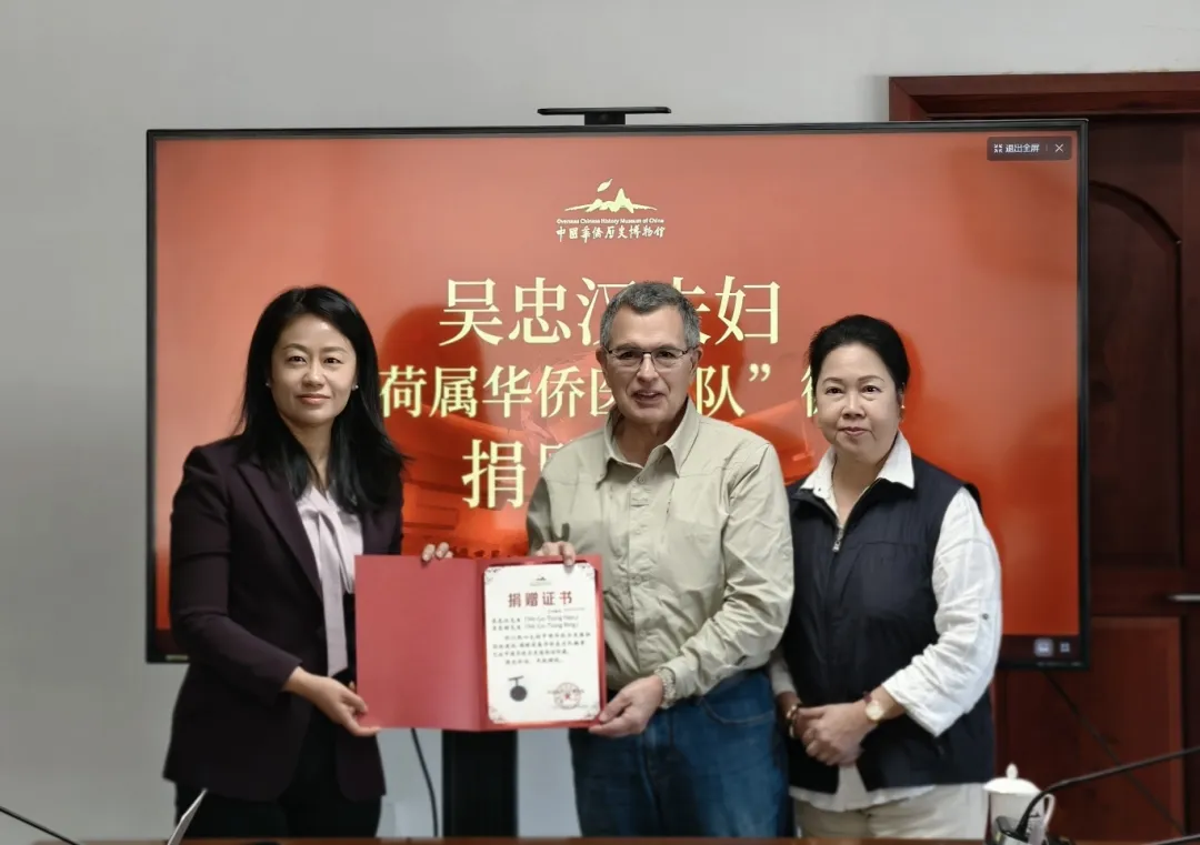 11月4日上午,抗戰(zhàn)時期“荷屬華僑醫(yī)療隊”隊長吳云燦之子吳忠漢與夫人劉美英一行,從荷蘭專程來華,到訪中國華僑歷史博物館,捐贈吳云燦生前佩戴的荷屬華僑醫(yī)療隊徽章,將這份承載著華僑愛國情懷的歷史信物交付博物館珍藏。中國華僑歷史博物館副館長雷霆接受捐贈,并為吳忠漢夫婦頒發(fā)捐贈證書。