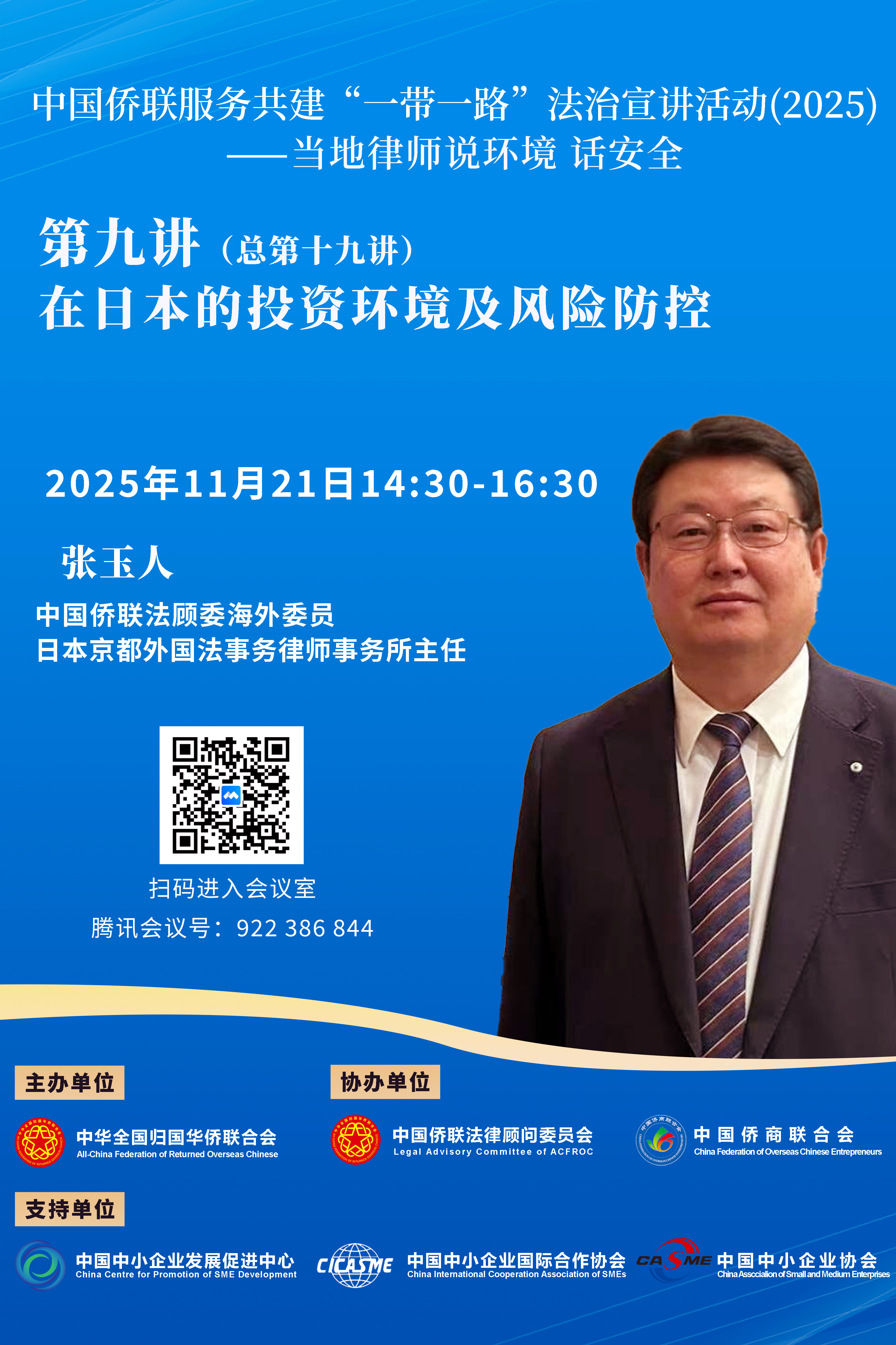 今年第九講(總第十九講)將于2025年11月21日(周五)14:30開播,由中國僑聯法顧委海外委員日本張玉人律師主講。張律師畢業于日本國神奈川大學,獲得法學碩士學位,曾在日本L&J律師事務所執業多年,于2010年10月成立了京都外國法事務律師事務所,并擔任律師事務所主任。張律師具有中國律師資格和日本外國法事務律師資格,具有深厚的中日法律知識功底和執業經驗,從事涉外法律工作24年以來,處理了知識產權、勞動糾紛、工傷事故、交通事故、醫療事故、國際婚姻糾紛等法律問題。張律師還擔任最高人民法院中華司法研究會理事、全日本華人促進中國和平統一協會執行會長、在日中國律師聯合會創始副會長等職務,并于2021年8月起,在網上免費開辦法律講座,向在日華僑華人宣傳中日法律知識,深受好評。