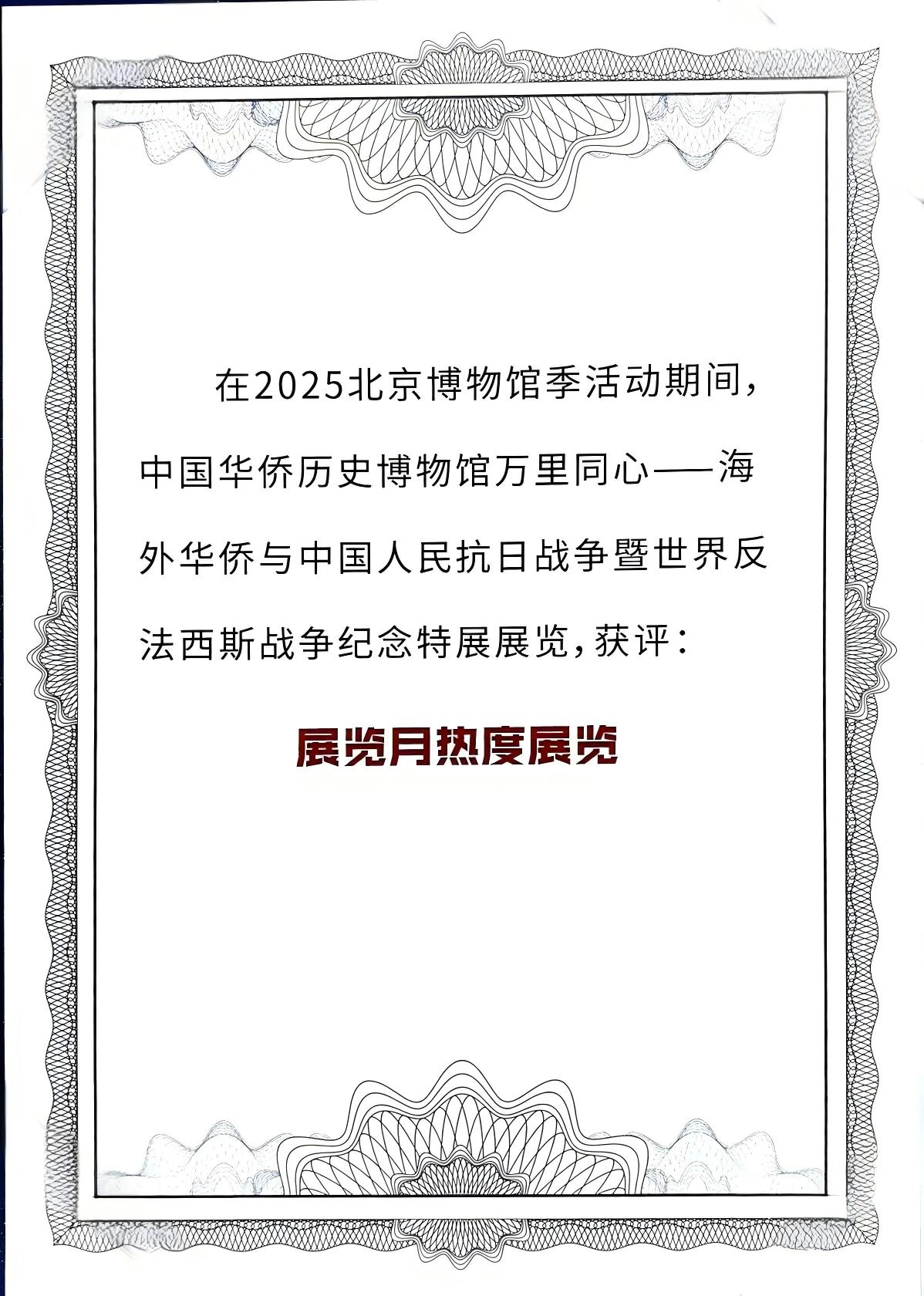 “萬里同心——海外華僑與中國人民抗日戰爭暨世界反法西斯戰爭紀念特展”入選中央網信辦、國家文物局2025年度“博物館里讀中國——弘揚中華優秀傳統文化、培育社會主義核心價值觀”主題展覽推介項目;該展覽還入選中央宣傳部、中央網信辦、國家文物局紀念中國人民抗日戰爭暨世界反法西斯戰爭勝利80周年主題陳列展覽推介名單。